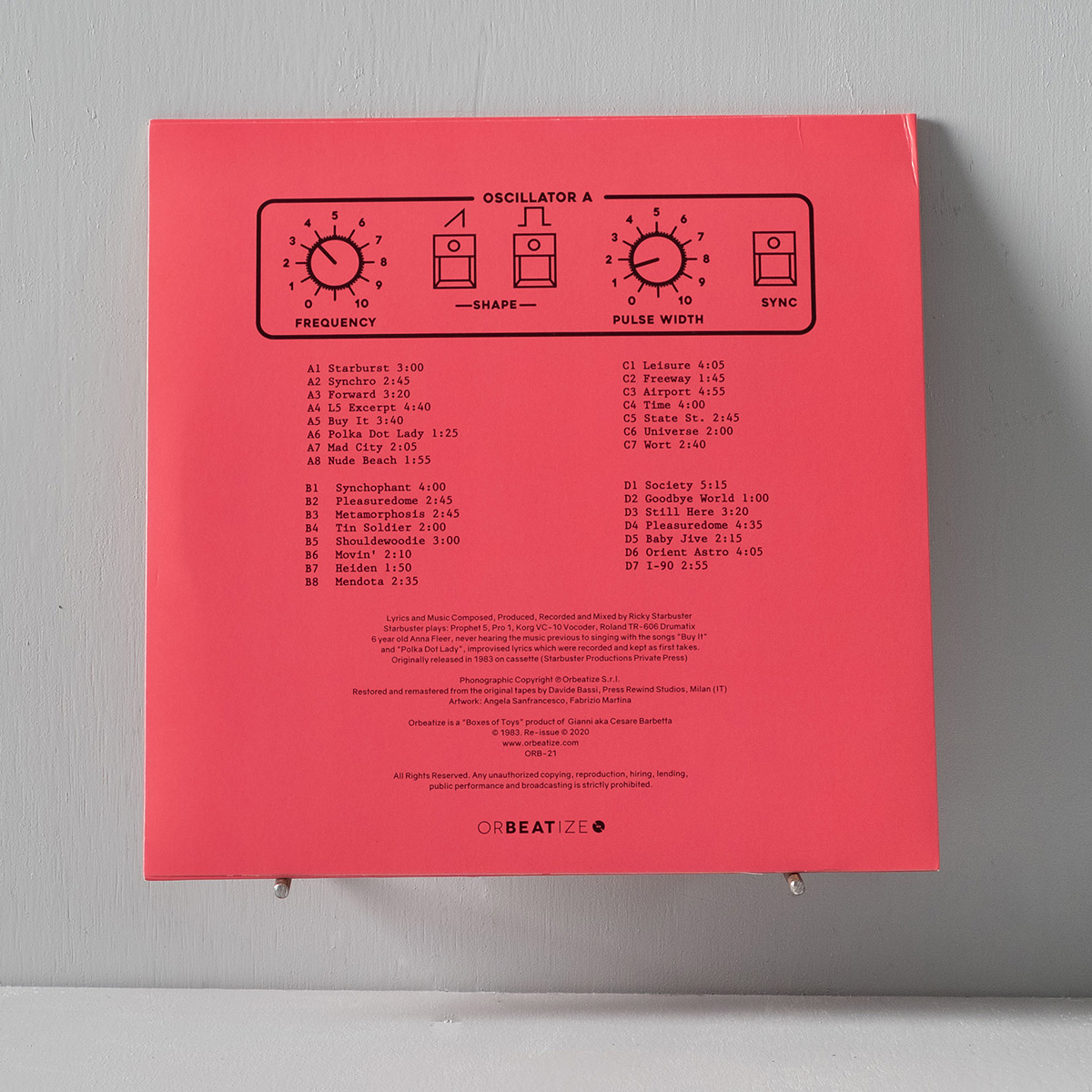 Artwork by: Angela Sanfrancesco, Fabrizio Martina; remastered by Davide Bassi; lyrics and music composed, produced, recorded, and mixed by Ricky Starbuster. Originally released in 1983 on cassette (Starbuster Productions Private Press). Restored and remastered from the original tapes by Davide Bassi, Press Rewind Studios, MI. "600 copies limited edition"